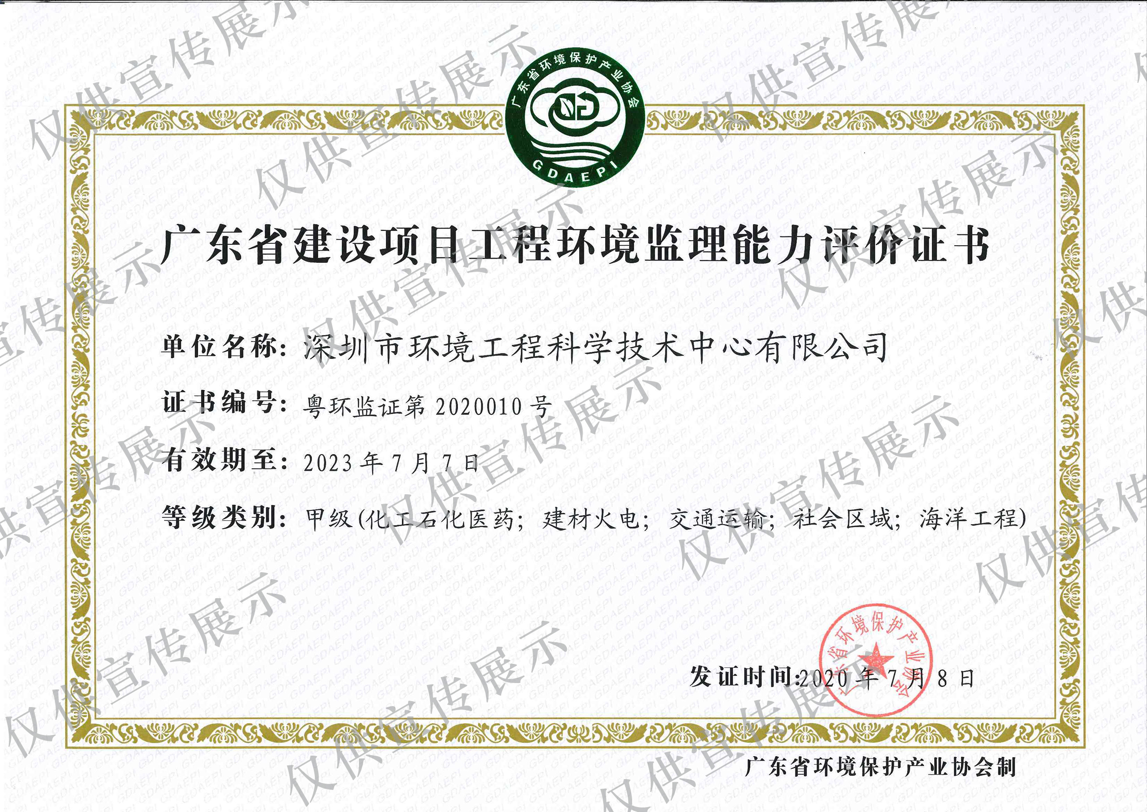 • 廣東省建設(shè)項(xiàng)目工程環(huán)境監(jiān)理能力評價證書